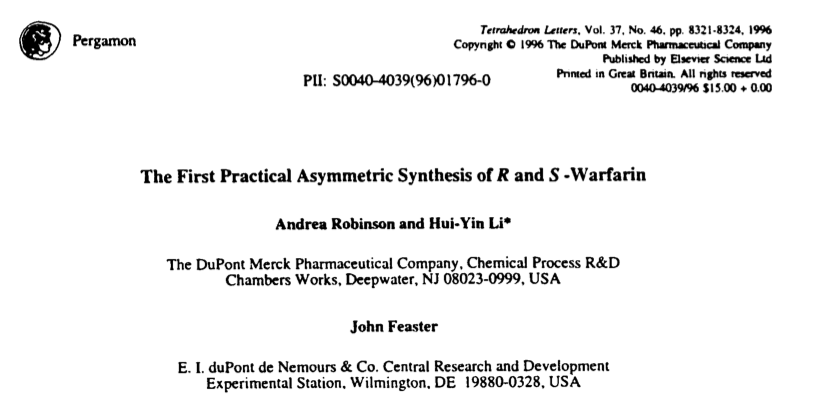 I came back to Monash after industrial research at the DuPont Merck Pharmaceutical Company in Wilmington, Delaware, USA. The Experimental Station, nestled on the banks of the Brandywine River, was an enriching place to work with a vibrant research culture. Here I was immersed in several projects within the Discovery and Kilo Processing teams. Research involved the development of steroidal nitrones as stable enolate derivatives to act as competitive inhibitors of the 5α-reductase enzyme. This enzyme converts testosterone into dihydrotestosterone, the later being the more potent androgen and connected to enlargement of the prostate gland → prostate cancer. The team was also interested in ACAT inhibitors to prevent atherosclerosis. This program led to some lovely, unexpected chemistry which involved an Aza-Ene reaction and multiple rearrangements to yield a stable quinazoline. These were found to be potent estradiol mimetics! An opportunity later arose to work on the company’s most important product, Coumadin, the most widely-prescribed anti-thrombolytic agent in North America. A two-step, asymmetric synthesis of this molecule was developed using a chiral catalyst and hydrogenation as the key step. The process was patented and the chiral warfarin market was secured. In 1996 is I was awarded a DuPont Merck Research Award.